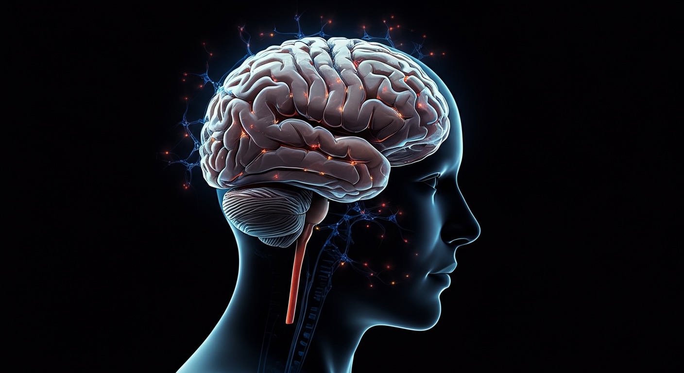 Un cerebro humano conectado a redes neuronales abstractas que forman patrones complejos, representando los factores neurobiológicos y cognitivos detrás del comportamiento alimentario.